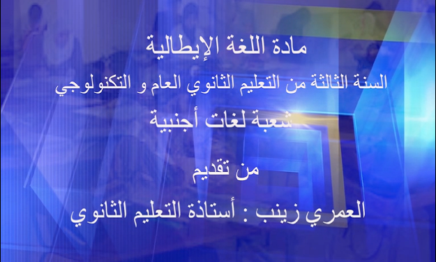 http://webtv.cerist.dz/men/wp-content/uploads/2020/05/العمري-زينب-مادة-اللغة-الإيطالية3-1.m4v مادة اللغة الإيطالية — السنة الثالثة من التعليم الثانوي العام و التكنولوجي من تقديم الأستاذة : العمري زينب– Post navigation اللغة الإيطالية – 3 ل أ – الحصة 2 التاريخ -3 آ ف – 3 ت إ- الحصة 1