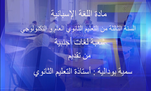 http://webtv.cerist.dz/men/wp-content/uploads/2020/05/اللغة-الإسبانية-3-ل-أ-الحصة-4-1.m4v مادة اللغة الإسبانية — السنة الثالثة من التعليم الثانوي العام و التكنولوجي من تقديم الأستاذة : سمية بودالية– Post navigation اللغة الإسبانية-3 ل أ-الحصة 3 اللغة الإسبانية-3 ل أ-الحصة 6